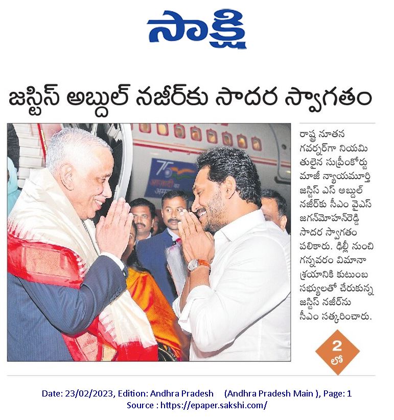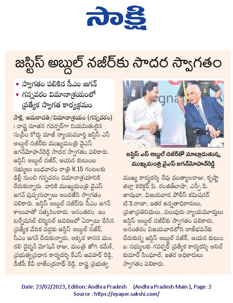 జస్టిస్ అబ్దుల్ నజీర్ కు సాదర స్వాగతం