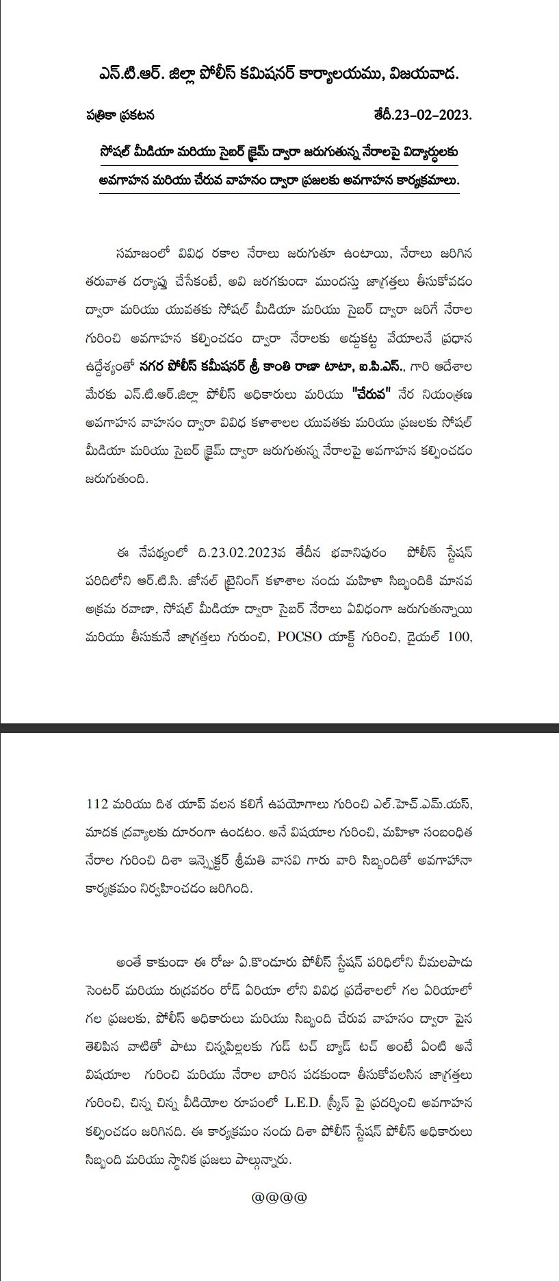 సోషల్ మీడియా మరియు సైబర్ క్రైమ్ నేరాలపై విద్యార్థులకు అవగాహన మరియు చేరువ వాహనం ద్వారా ప్రజలకు అవగాహన