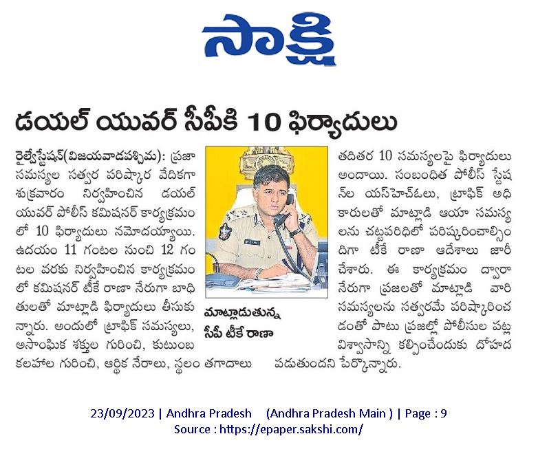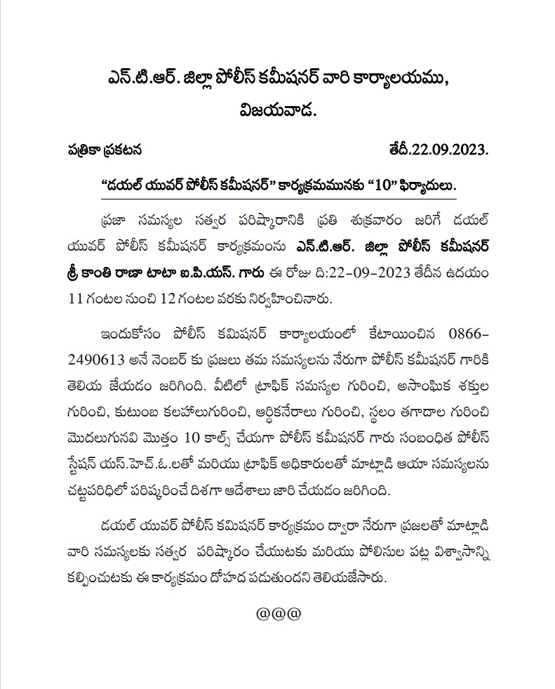 “డయల్ యువర్ పోలీస్ కమీషనర్” కార్యక్రమమునకు “10” ఫిర్యాదులు